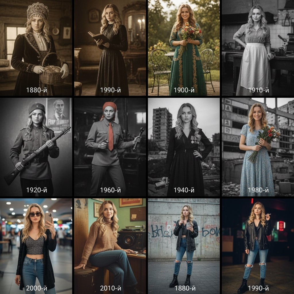 Хватит баловаться обычными фильтрами старения. Нашел способ сделать из себя исторического персонажа в 16 разных эпохах — от бородатого купца в 1880-х до стиляги и хипстера. 🌚 Это сетка 4х4, где нейронка максимально точно выдерживает твое лицо, но полностью меняет антураж: одежду, прическу и даже «зерно» пленки под каждый период. Выглядит как серьезное исследование, а не просто кривая маска из соцсетей. 🗿 Чтобы лицо оставалось твоим, а не превращалось в рандомного деда, лучше всего скармливать этот промпт моделям Nano Banana или Seedream. Они сейчас лучше всех держат консистентность. 🔥 Фотореалистичный коллаж из сетки размером 4×4 (16 панелей), по вертикали 3:4, изображающий одного и того же человека с эталонной фотографии, стилизованной для каждого десятилетия с 1880 по 2010 год. Типичный взрослый человек (30 лет), преображенный в соответствии с русской/советской эстетикой той эпохи: одежда купца, красноармейская буденовка, костюм "стиляга", кожаная куртка 90-х. На каждой панели пре