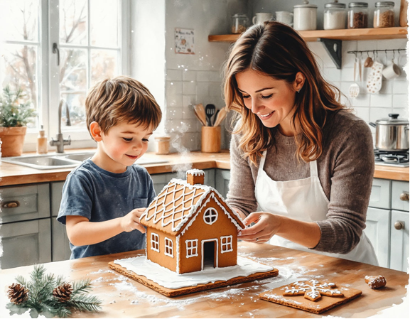 Выпечка наполнила квартиру таким божественным ароматом, что, казалось, сам воздух стал съедобным. Пряный, тёплый, уютный. Имбирные фигурки — звёздочки, ёлочки, человечки — и части домика золотились в духовке. Ваня прилип носом к стеклу, наблюдая, как они «растут».