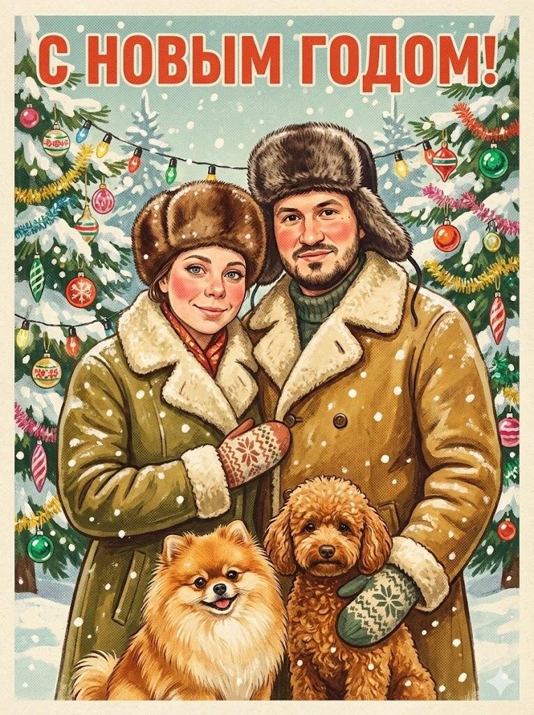Сделайте свою открытку к Новому году. А дальше выкладываю промпты, которые можно использовать для создания таких же открыток: Используй персонажа(ей) с прикрепленного фото; сохрани точные черты лица/мимику и пропорции, без мультяшности. Портрет как советская новогодняя открытка 1950–70-х. Живописная иллюстрация гуашью/темперой на шероховатой бумаге, легкая печатная растровая фактура. Композиция: персонажи чуть повернуты к камере, мягкие полуулыбки, прямой взгляд. Образ: теплые шубы/дубленки, у мужчины шапка из ондатры, у женщины из норки, варежки с орнаментом; естественный румянец щек от мороза. Фон: пушистые ели, увешанные советскими стеклянными игрушками и гирляндой лампочек; крупные снежинки падают на переднем плане. Внизу зверушки. Надпись в характерной советской типографике: «С НОВЫМ ГОДОМ!» (в стилистике ретро-плаката), узкая светлая рамка по краям. Палитра тепло-винтажная: охры, оливковый, киноварь, изумруд, снежно-белый; мягкие тени без глубокого контраста. Атмосфера уютная,