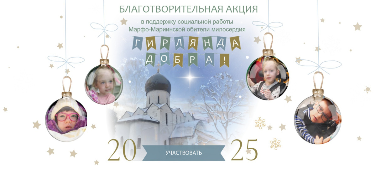 В преддверии праздника Рождества Христова ставропигиальный женский монастырь — Марфо-Мариинская обитель милосердия в Москве проводит рождественскую акцию «Гирлянда добра». Цель акции — собрать средства на помощь подопечным обители (многодетным и малоимущим семьям, детям с инвалидностью, одиноким пожилым людям, всем, кто оказался в трудной жизненной ситуации). Традиционная рождественская акция пройдет уже в седьмой раз. Принять участие в акции может любой желающий. На сайте акции «Гирлянда добра» можно «зажечь» свой огонек на виртуальной гирлянде, сделав пожертвование на любую сумму. Каждый участник акции получает подарок — уникальную дизайнерскую заставку на телефон. «Гирлянда добра — это не просто акция, это настоящее рождественское чудо, которое мы создаем вместе. Каждый огонек на нашей гирлянде — это частичка вашего тепла, которая согревает тех, кто особенно нуждается в заботе», — отмечает руководитель благотворительных проектов обители Екатерина Шашова. Ежемесячно Марфо-Мариинская