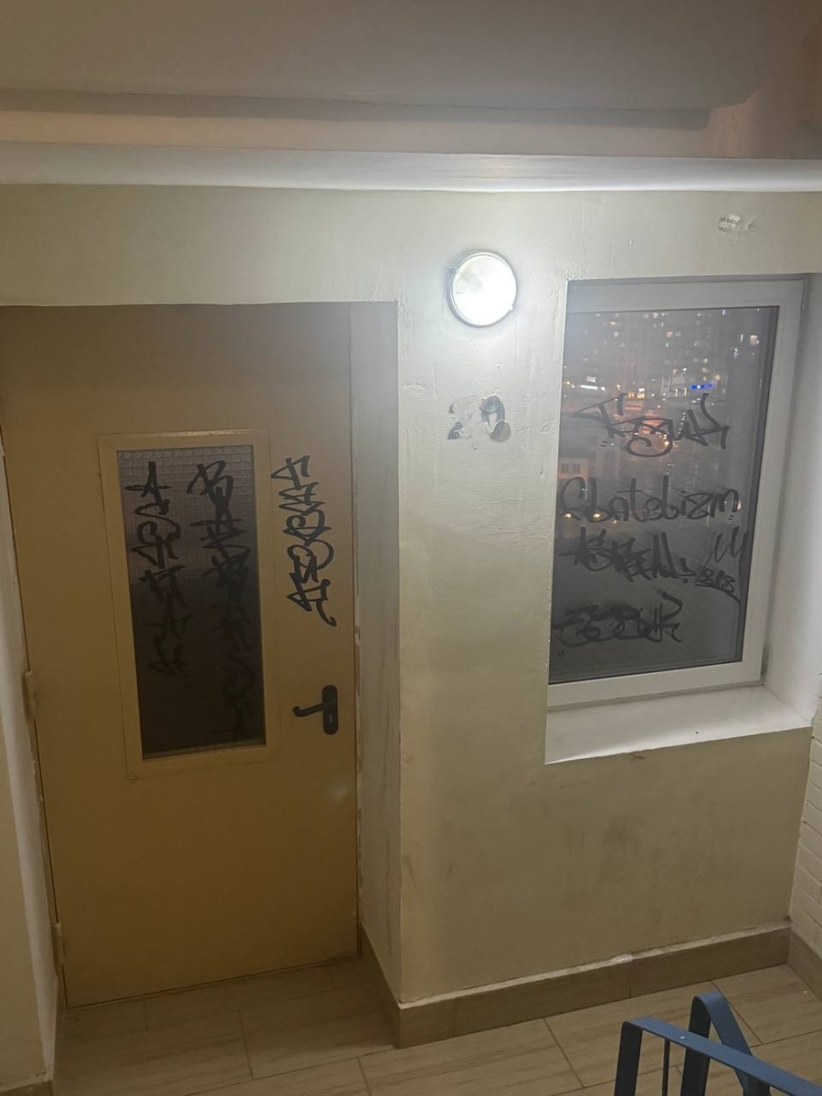 Вообще а***ли? Весь этаж изрисован, выглядит отвратительно, вернитесь и сотрите все это! Мерзость