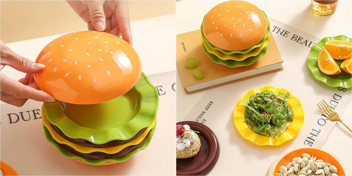 В собранном виде он выглядит как стильный декор в виде гамбургера, но на самом деле скрывает в себе 7 отдельных тарелок, каждая из которых имитирует слой любимого блюда: от "пышной булочки" до "свежего салата" и "сочной котлеты". Все 7 тарелок складываются вертикально, занимая минимум места. В собранном виде тарелки накрыты верхней «булочкой-крышкой», что защищает их от пыли. Это не просто забавный декор, а по-настоящему практичный предмет для кухни, который идеально подойдет как для ежедневного использования, так и для встреч с друзьями.