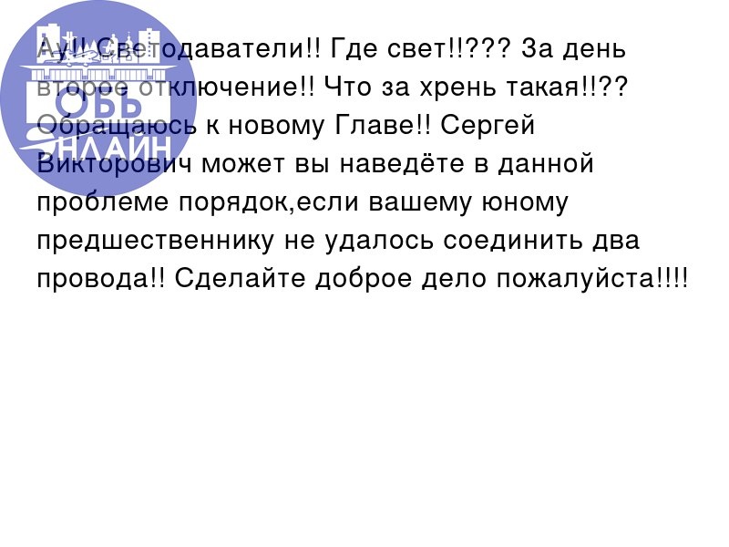 ↗ Ау!! Светодаватели!! Где свет!!??? За день второе отключение!! Что за хрень такая!!?? Обращаюсь к новому Главе!! Сергей Викторович может