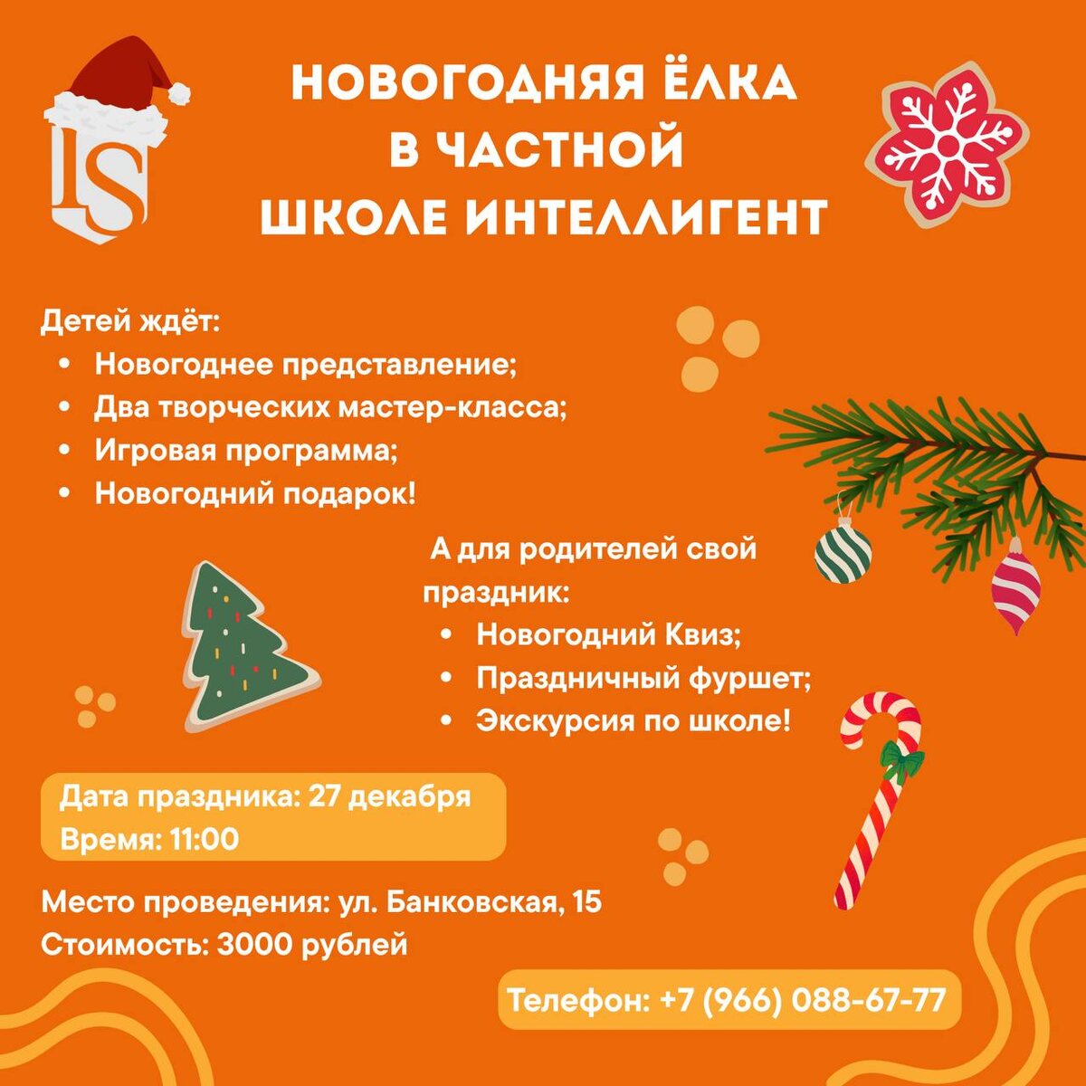 Солнечногорск🎄 Скоро самый волшебный праздник — Новый год! ❄️ Частная Школа ИНТЕЛЛИГЕНТ приглашает детей от 4 до 10 лет и их родителей окунуться в атмосферу настоящей зимней сказки! 🗓Дата праздника: 27 декабря в 11:00 Детей ждёт: 🎭 Волшебное новогоднее представление; 🎨 Два творческих мастер-класса; 🤶 Игровая программа с Дедом Морозом, Снегурочкой и Бабой Ягой; 🎁 Настоящий новогодний подарок для каждого ребенка! У родителей своя программа: 💡 Увлекательный Новогодний Квиз; ☕️ Праздничный фуршет; 🏫 Экскурсия по школе! 📍Место проведения: г. Солнечногорск, ул. Банковская, 15 📌 Стоимость: 3000 рублей ❕Также сегодня в 19:00 стартует РОЗЫГРЫШ БИЛЕТА НА НОВОГОДНЮЮ ЁЛКУ в нашем ТГ-канале. Подписывайтесь, чтобы не пропустить. ❗️Количество мест ограничено! Успейте записаться на самый волшебный праздник этой зимы! 👇 📞 Запишитесь по телефону: +79660886777 🔗 Яндекс-форма для записи: https://forms.yandex.ru/cloud/693fcf1bd046885e9446f142/ #НовогодняяЕлкаСолнечногорск #ШколаИНТЕ
