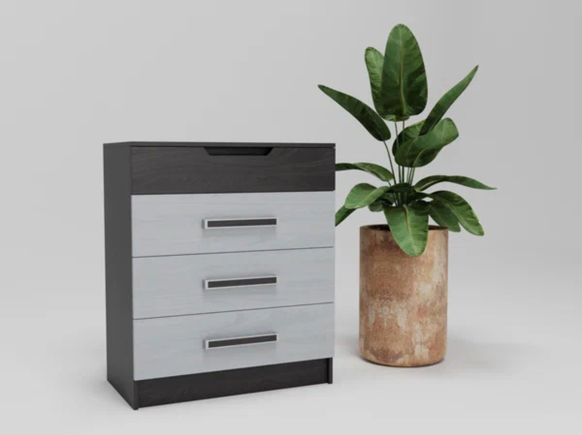 На фото комод выполнен в контрастной палитре: глубокий графитовый корпус и светлые фасады ящиков с деликатной древесной текстурой. Три просторных выдвижных ящика с лаконичными металлическими ручками и узкий верхний ящик с декоративным фасадом создают строгую и современной силуэт, который легко впишется как в сканди- или минималистичный интерьер, так и в более тёплые, эклектичные решения.