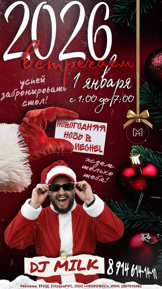 🎄 Друзья, в новогоднюю ночь с 01:00 до 07:00 DJ Milk посетит Mechel Night Club, чтобы зажечь танцпол и ваши сердца. Успей забронировать стол!!! Ждем вас с четверга по воскресенье в 22:00🔥 📍Инженерная, 32 📲89146141410