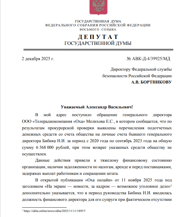 Единственное, в чём СК признал Бибика виновным – это уклонение от налогов, однако пени и штрафы за это ложатся, внимание, не на самого Бибика, а на юридическое лицо, то есть на ТРК «Оха». И без того высосанный почти до нитки.