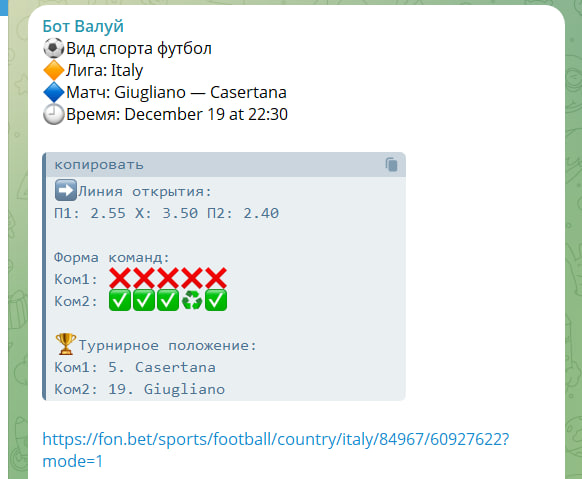 Бот присылает сигналы по линии открытия Фонбет по 4 видам спорта: футбол, баскетбол, волейбол и хоккей Он отбирает матчи, где имеется явный перевес по текущей форме одной команды над другой. В среднем это 20-30 сигналов в день. К сожалению в половине из сигналов кф выставлены в целом верно, и такие сигналы программно невозможно отфильтровать. Но бот существенно помогает сузить группу поиска интересных матчей. Преимущества: