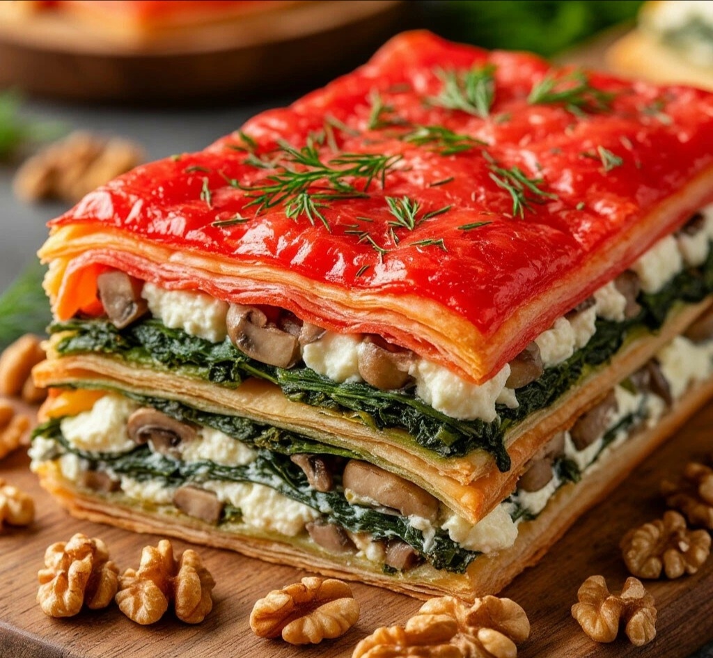 Мяу, мои ценители торжественной и эффектной выпечки! 😺 Представьте знаменитый торт «Наполеон», но... в несладком исполнении! Три тончайших слоёных коржа и три разных начинки: лососевая, грибная и со шпинатом. Это не просто закуска, это главное украшение стола, которое готовится заранее! 🇫🇷