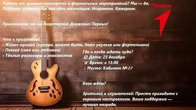 ❓Надоело всё официальное? Нам тоже! 🗣️ Поэтому приглашаем вас на настоящий квартирник — уютный, искренний, душевный! Что будет: 🎸 Живая музыка: гитара, укулеле, фортепиано 📘 Стихи — ваши любимые или собственные 👥 Тёплые разговоры и новые знакомства в кругу друзей Когда и где: 📅 Дата: 23 декабря ⏰ Время: 15:00 👉 Место: Кабинет №27 ✨ Приходите с хорошим настроением — ваша поддержка очень важна! #ДвижениеПервых #Квартирник #Музыка #Поэзия #Творчество