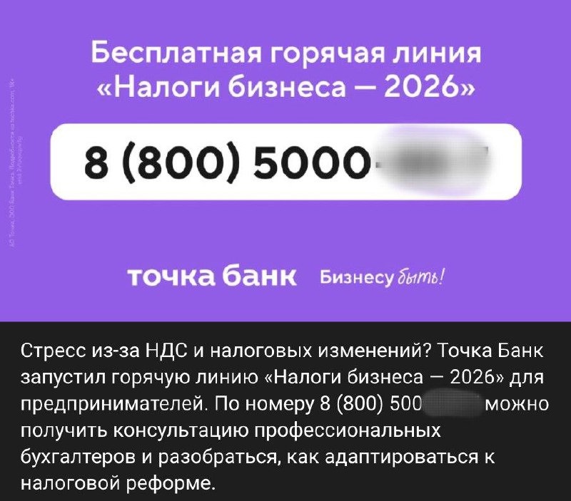 Налоговые изменения и рост НДС создают для бизнеса ощутимый стресс - настолько, что банки вынуждены запускать отдельные горячие линии. Так, Точка Банк открыл консультационную линию «Налоги бизнеса — 2026», где предпринимателям помогают разобраться, как выжить в новом году. Факт показательный: напряжение вокруг НДС настолько высокое, что бизнесу сначала нужно «успокоить голову», а уже потом считать цифры. Мы идем другим путем. Наша задача изначально выстроить НДС так, чтобы он не превращался в источник постоянного стресса. Проверенные вычеты, корректная модель, спокойная работа без нервов, блокировок и бесконечных уточнений — именно для этого и создан Telegram-сервис @ProffLinkBot. 🔖 Когда НДС посчитан правильно, горячие линии просто не нужны.