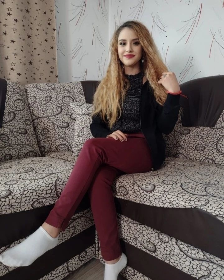 На мягком диване, украшенном причудливым узором, словно сошедшим со страниц старинной сказки, грациозно сидит молодая женщина. Её поза — воплощение непринуждённой элегантности: одна нога небрежно закинута на другую, а рука, украшенная тонким браслетом, нежно касается прядей длинных, золотистых волос, будто играя с солнечными лучами.