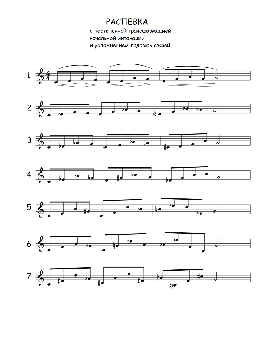 Если какой-то из последних фрагментов распадается на отдельные интервалы или кажется немузыкальным, следует остановиться на предыдущем и начать петь с первой распевки на полтона выше.