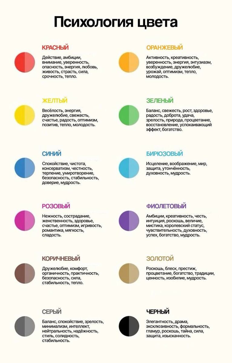 ? Мои милые, нам по сути не важно, про что говорит сам цвет. Нам важно, за что он отвечает конкретно у нас! 🔗 Есть такое понятие как психология цвета. Выше 👆🏻 вы видите, за что отвечает базово каждый цвет. 🔠🔠! Конкретно для каждой из вас он может значить совсем другое… Как это работает и почему так? В астрологии каждая планета и знак связаны с цветами. И так как каждая планета сама по себе отвечает за определенные функции и окрашена энергией определенного знака (у каждой из вас эти показатели будут индивидуальны) 👉🏻 то и цвета будут иметь индивидуальное значение. Например, у одной из вас Венера в Овне ♈️и на тот же заработок и отношения будет влиять красный цвет, а у другой Венера в Тельце ♉️и зарабатывать поможет розовый или оливковый цвета. 👁 Представьте, как классно, когда вы можете по любви или не любви к цвету понять: Ага, а вот тут у меня слабая/сильная зона или вот здесь я могу добиться большего результата/вырасти. 📝 Поэтому все очень индивидуально и именно поэ