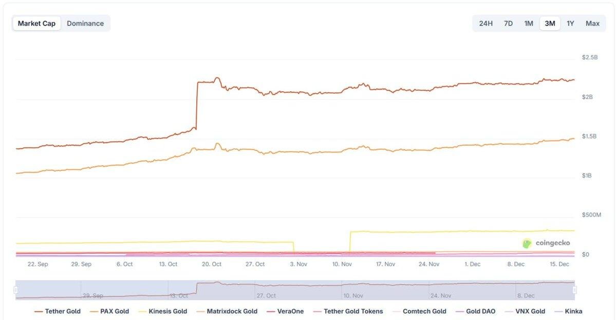 Этот показатель демонстрирует значительный рост на 147% за последние полгода. Доминирующую позицию на рынке занимают два актива: XAUT от Tether и PAXG от Paxos, которые совокупно контролируют почти 90% всей капитализации.