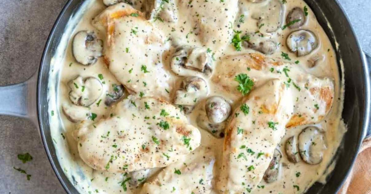 - Добавляем сливки: Уменьшить огонь и влить сливки в сковороду, добавить сушеный базилик, хорошо перемешать. Довести до легкого кипения, затем вернуть куриные грудки в сковороду. Накрыть крышкой и готовить на среднем огне еще 10-15 минут, пока курица не станет полностью готовой.