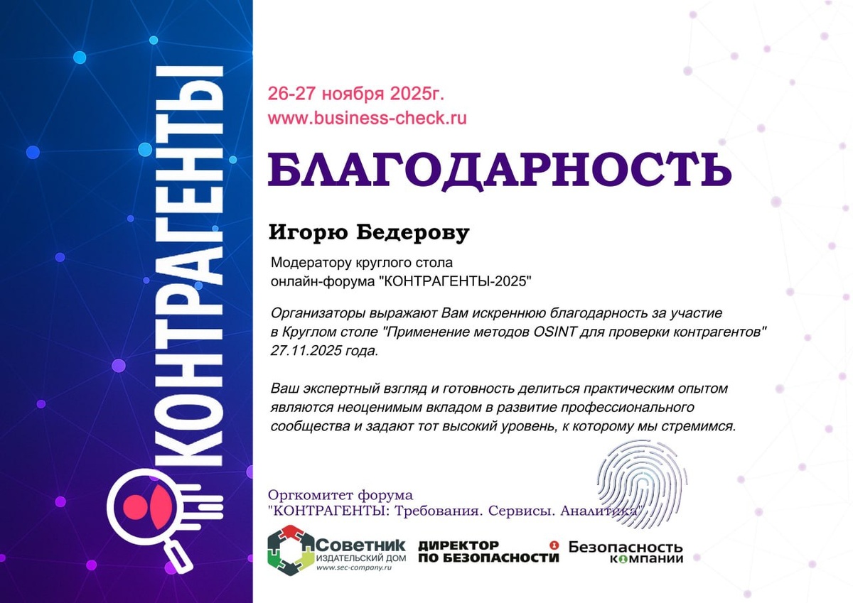 : Требования. Сервисы. Аналитика». Как модератор круглого стола по OSINT-методам проверки контрагентов, я вновь убедился: только открытый обмен реальным опытом двигает нашу профессиональную среду вперёд. Особенно ценно, когда твой вклад замечают и высоко оценивают. Огромная благодарность Оргкомитету форума за тёплые слова и признание! Для меня такая обратная связь — лучший показатель того, что мы на правильном пути, говоря о важном. Подпишись на @ibederov