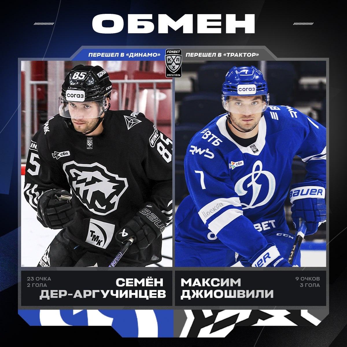 «Трактор» и московское «Динамо» произвели обмен нападающими: 25-летний Семён Дер-Аргучинцев 🔵 (2+21) отправится в Москву, а 29-летний Максим Джиошвили 🚜 (3+6) переедет в Челябинск.