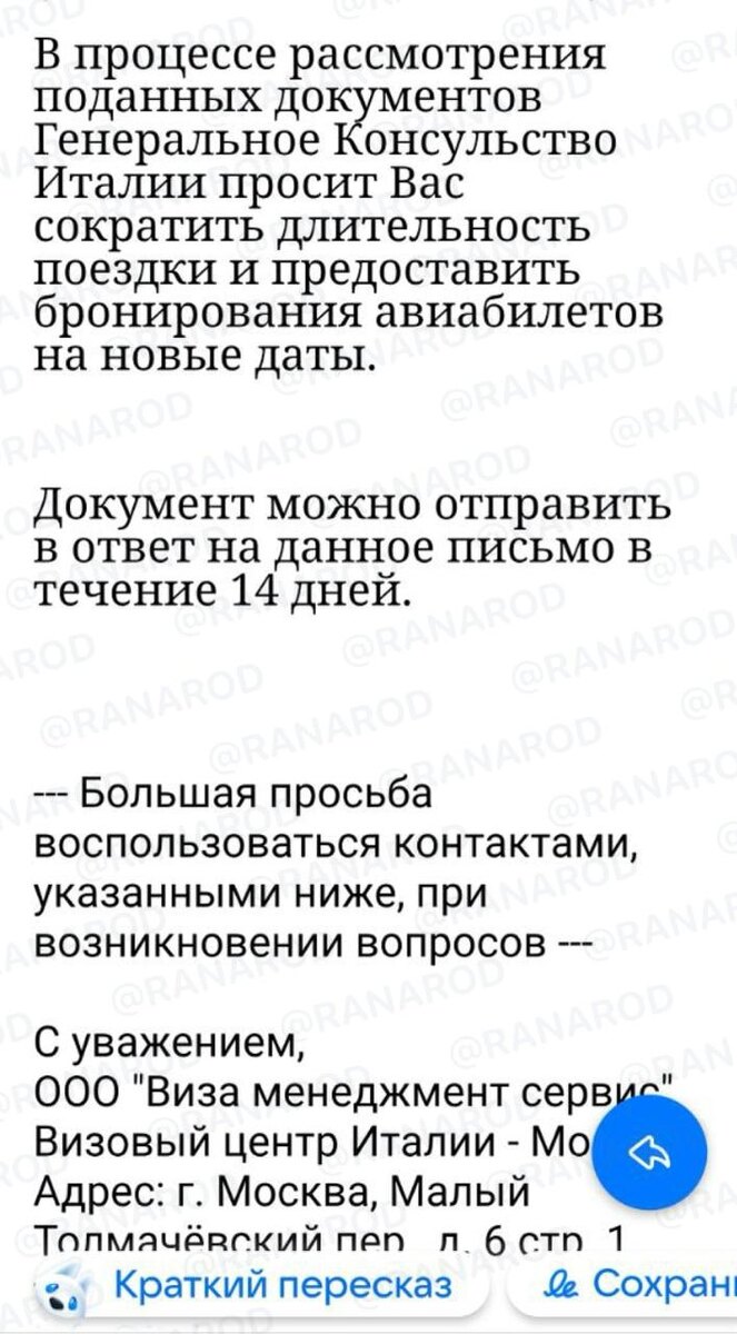новые даты. Об этом сообщает телеграм-канал @ranarod со ссылкой на туриста. Заявитель собирался в Италию по приглашению дочери, которая проживает в этой стране, планировал поездку на 89 дней. Ответ пришел спустя почти два месяца после обращения. Когда отправил в визовый центр новые билеты, пришло разрешение на въезд на 50 дней. При этом у мужчины хорошая визовая история: ранее у него была 2-летняя итальянская виза. Подробнее написали на ТурДоме. Фото: @ranarod @tourdom