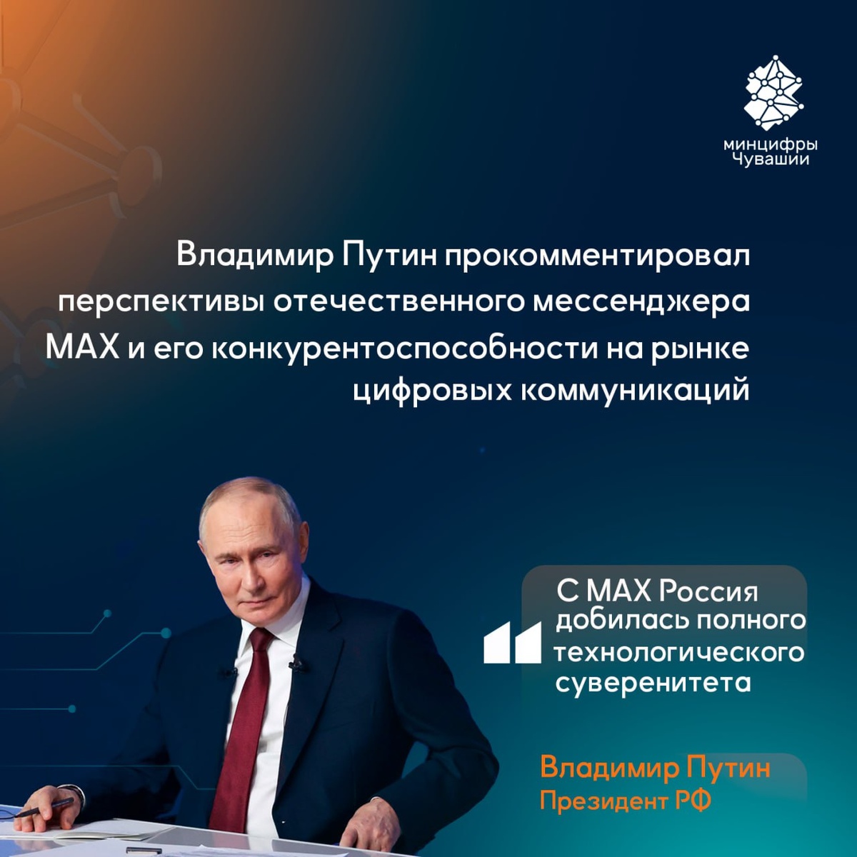 На Прямой линии глава государства подчеркнул стратегическую важность создания национальных технологических решений для защиты данных граждан. Ключевые позиции: ⚡️Разработка «МАХ» признана своевременным и необходимым для страны решением. ⚡️Отечественный мессенджер позволил России обеспечить полный цифровой суверенитет. ⚡️Зарубежные платформы не могут гарантировать полного соответствия российскому законодательству. ⚡️При этом Президент подтвердил курс на сохранение здоровой конкуренции на рынке цифровых коммуникаций. У нас было всё, кроме собственного мессенджера. Теперь Россия — одна из трёх стран, обладающих цифровым суверенитетом, вместе с США и Китаем.Теперь мы можем оказывать гражданам услуги через МАХ. Мы, там, кстати, тоже есть — подписывайся #МинцифрыЧувашии ЦИФРОВЫЕ НОВОСТИ ЧУВАШИИ