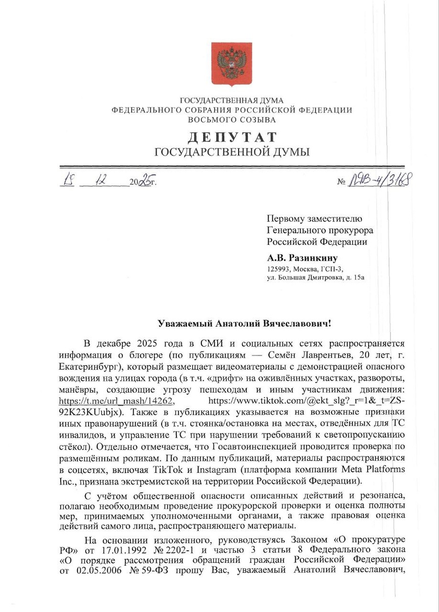 ❌Согласно публикациям в СМИ и социальных сетях, 20-летний Семён Лаврентьев регулярно практикует опасное вождение на загруженных дорогах Екатеринбурга. Он выполняет развороты на 360 градусов и манёвры, создающие угрозу пешеходам и другим участникам дорожного движения. Также зафиксированы возможные нарушения ПДД — парковка на местах для инвалидов и чрезмерная тонировка стёкол. Видео с его участием пропагандируют опасное поведение и популяризируют противоправные действия. Это представляет серьёзную угрозу общественной безопасности, особенно с учётом широкого распространения контента в интернете (более 200 роликов в TikTok и Instagram*, где Instagram принадлежит Meta Platforms Inc., признанной экстремистской организацией в РФ). Сообщается, что ГИБДД уже разыскивает водителя. ✍️Обратилась в Роскомнадзор с просьбой провести проверку и принять меры, включая блокировку указанных видео. Также направила запрос в Прокуратуру с просьбой организовать проверку изложенных фактов, дать правовую оцен