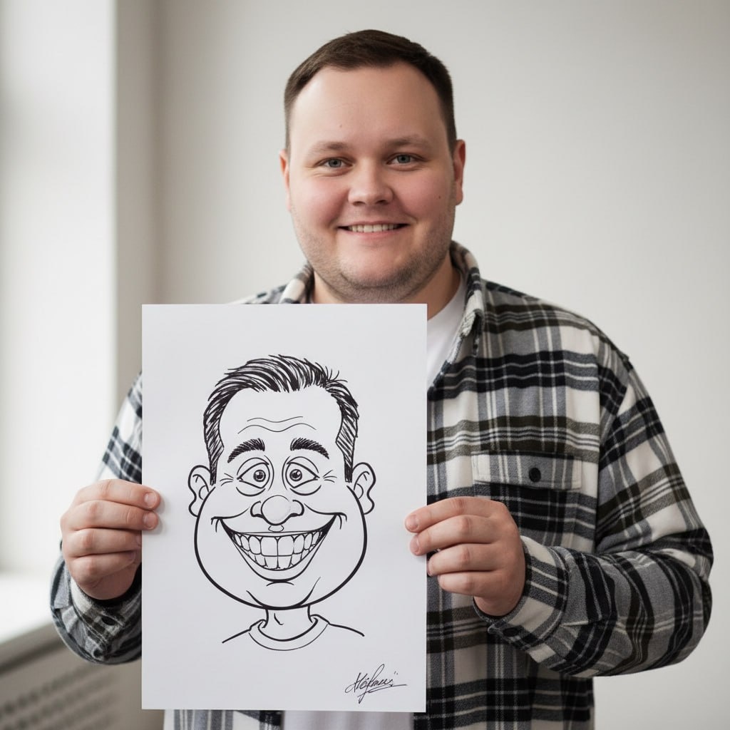 Завезли лютую технику, где нейронка не просто рисует случайного человечка, а делает жесткий «проброс» по твоим реальным чертам. Фишка в том, что герой держит в руках карикатуру на самого себя: черты лица гипертрофированы, но сходство остается идеальным за счет сохранения структуры челюсти, формы бровей и прически. Жирные чернильные линии, чистый ч/б и фактура бумаги — выглядит так, будто тебя только что отскетчил профи в парке. Никакого мыла и градиентов, только дерзкий стиль. Забирай промпт: Реальная фотография человека с высоким разрешением 8K, радостно улыбающегося в камеру и держащего обеими руками черно-белую сатирическую карикатуру на себя самого формата А4. Карикатура должна быть мгновенно узнаваема как личность — та же прическа, характерное строение лица (линия подбородка, форма бровей, расположение ушей) и уникальные черты должны быть четко воспроизведены, но преувеличены в юмористической форме: большой рот с выступающими зубами, увеличенные выразительные глаза, преувеличенная