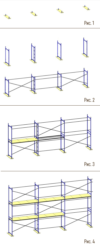 Рис. 2 В опоры простые установить две смежные рамы первого яруса, и соединить их горизонтальными и диагональными связями. Через шаг установить две смежные рамы и также соединить их связями и повторить эту операцию для набора необходимой длины лесов.