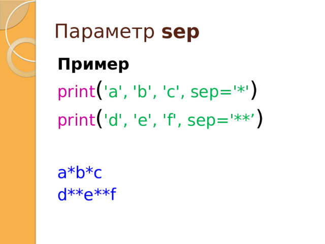 Сейчас у нас аргументы разделены символом звёздочки *. Также в качестве параметра sep мы можем указать и переменную.