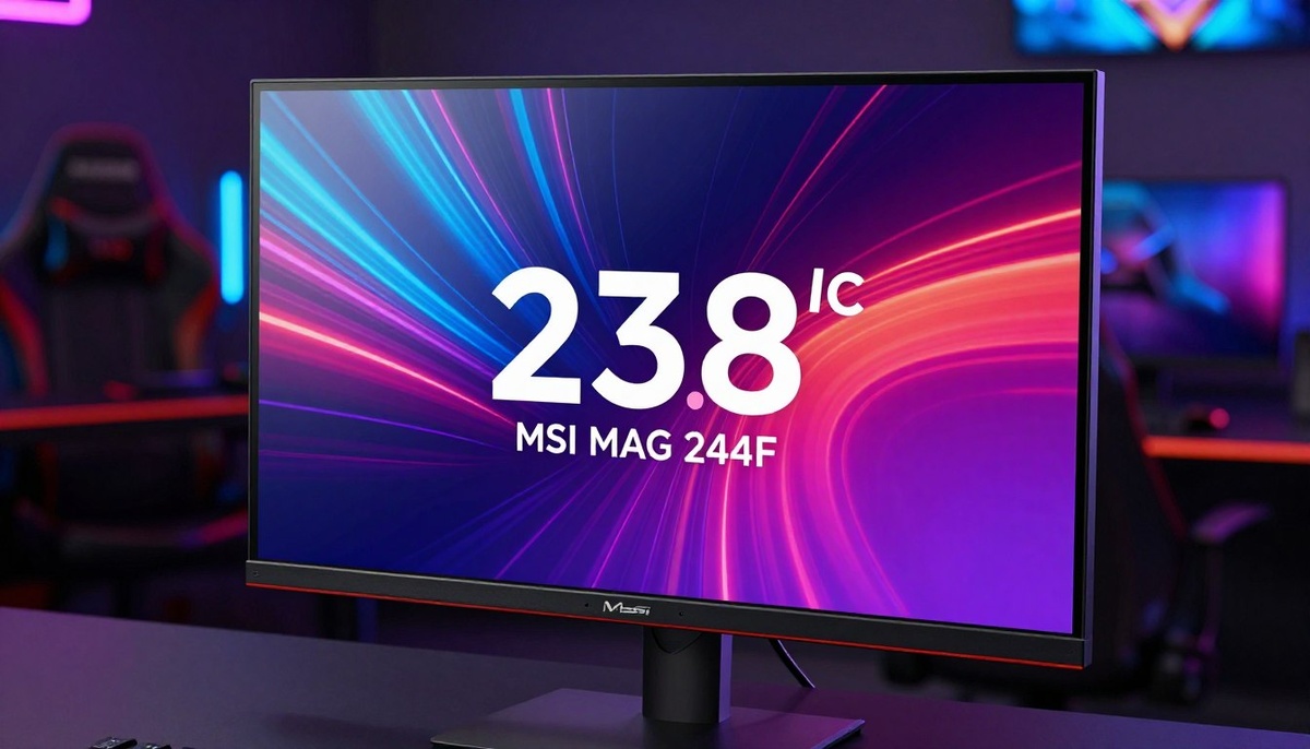 A high-end gaming monitor, specifically the MSI MAG 244F, showcasing its sleek design and modern aesthetics. The monitor features a sharp 23.8-inch IPS display with a stunning 200Hz refresh rate. In the foreground, the monitor stands prominently on a stylish gaming desk, reflecting the ambient lighting. In the middle ground, soft LED lights enhance the gaming atmosphere, illuminating the screen with vibrant colors. The background includes a subtle blur of a gaming room adorned with tech gadgets, creating an immersive environment. The scene is well-lit, with a focus on the monitor, captured from a low angle to emphasize its size and features. The overall mood is energetic and cutting-edge, appealing to gaming enthusiasts. No text or logos are present in the image.