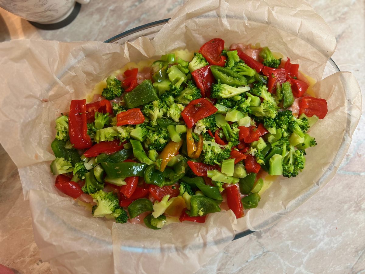 - Добавьте форель, затем брокколи и перец