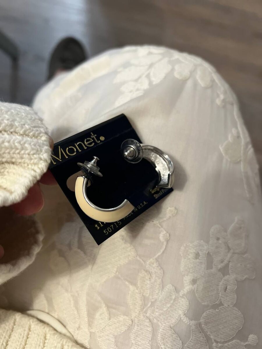 Серьги полукольца monet, серебряный тон и молочная эмаль, новые, 3см, стоят 4500р