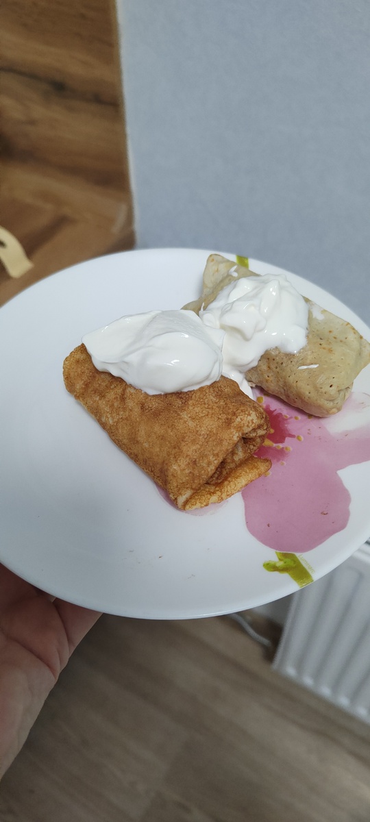 На завтрак отлично разгорелись и съелись запасы из морозилки блинов с фаршем. Чем постнее он будет, тем меньше калорийность. Добавила сметану