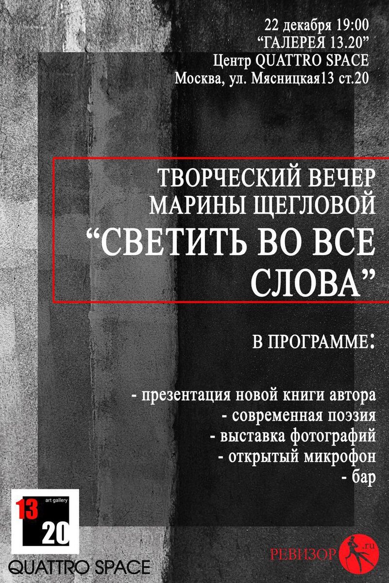 Академии Современных Искусств Марины Щегловой, приуроченный к выходу пятой книги автора «Светить во все слова». Книга Марины Щегловой «Светить во все слова» выпущена в уникальной серии «Лауреаты литературной премии Наследие» и уже является частью личной библиотеки Ее Императорского Высочества Великой Княгини Марии Владимировны Романовой. В программе: - презентация новой книги автора - современная поэзия в авторском исполнении - выставка фотографий - открытый микрофон - живая музыка - бар (welcome drink) Ведущий вечера Андрей Жуков Аккомпанемент Андрей Железняк Фотограф мероприятия Евгений Донда Адрес: Центр Quattro Space, «Галерея 13.20» (г. Москва, ул. Мясницкая улица, 13 ст.20) Вход свободный #sheglovaphoto