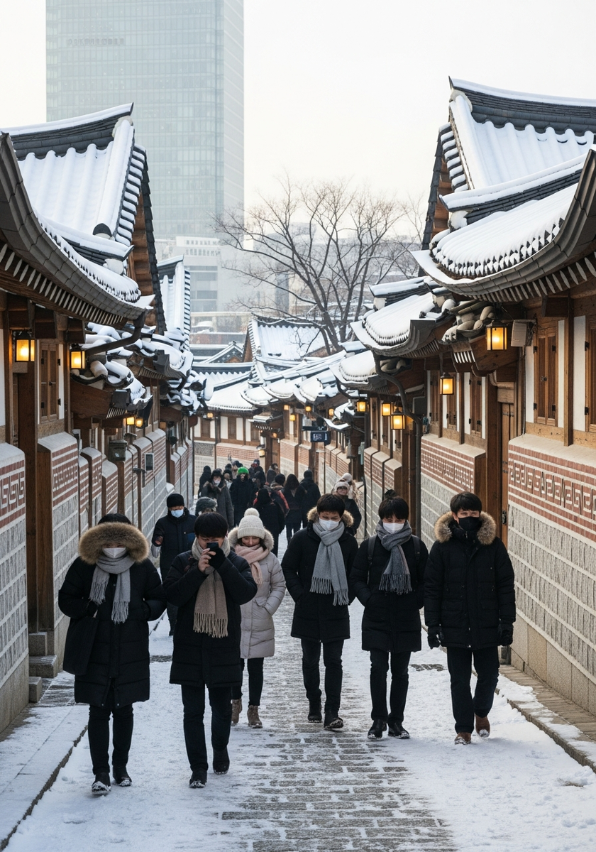 Живой музей традиционной корейской архитектуры в самом сердце Сеула. Более 900 ханоков — традиционных домов с изящными изогнутыми крышами — создают атмосферу старинной Кореи, особенно красивую зимой под легким снежным покровом.