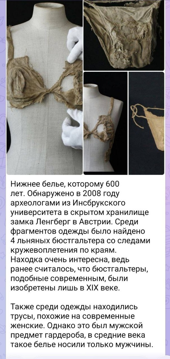 👙Т.е. 600 лет назад женщины такое носили, хотя все были уверены, что нет. Но факт налицо, приходится признать. Про лифчики. Но вот трусы мы женскими считать все равно не будем, потому что такие тогда носили мужчины. 📢 Алло, дорогие ученые, вы и про лифчики не знали, так почему бы не допустить, что и про трусы не знали всего? К тому же, логично, что если вещи обнаружены в одном месте все вместе, то и принадлежат они одному человеку — женщине. Но нет, логика учёных не такова. 🙈 Это я к чему такой оффтоп — к вере в "научные методы". Друзья, не все так однозначно в науке вообще, а уж в такой науке, как психология, — и подавно 🤷♀️ 🤔 И в эзотерике что-то есть, если грамотно использовать, и психолог доказательного метода может сотворить дичь. Доверяйте себе, ищите то, что вам помогает. Учитесь замечать, когда вас водят за нос