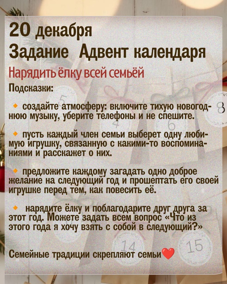 ! Продолжаем радовать наших детей очередным заданием Адвент календаря https://t.me/roditelskiyuniversitet/2289 Направляем вам десятое задание. Обязательно поделитесь как вы выполняли задание, своим опытом😉