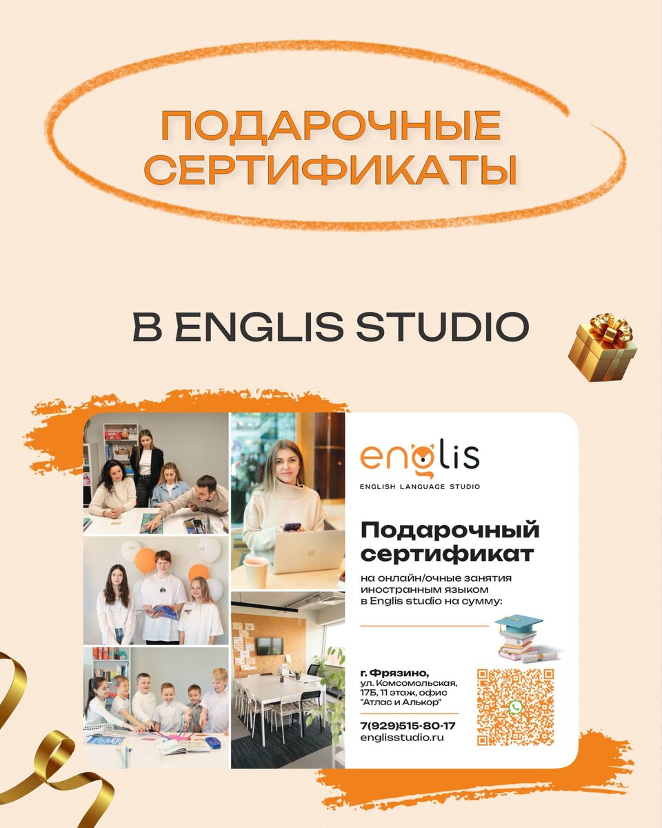 🎁 Что может быть ценнее того, что остаётся с человеком надолго? Подарочный сертификат на занятия иностранными языками в English Studio — это забота, развитие и уверенность в себе в одном презенте. Наши сертификаты подойдут для: 👥 детей и взрослых 💻 онлайн-занятий из любой точки мира 🏢 очных занятий в уютной атмосфере студии Иностранные языки — это новые мечты, путешествия, карьера и радость от собственных успехов. ✨ Порадуйте близких полезным и вдохновляющим подарком! Приобрести сертификат можно по ссылке 🔗