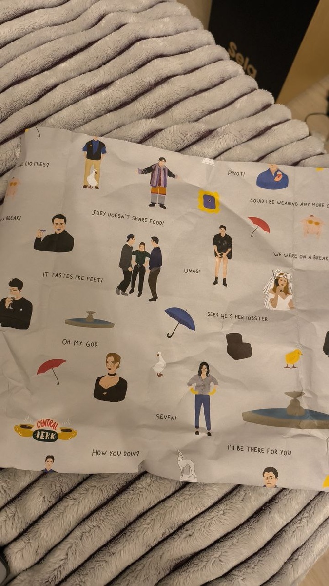 До меня только сейчас дошло что упаковочная бумага оформлена в стиле сериала "Друзья"😂