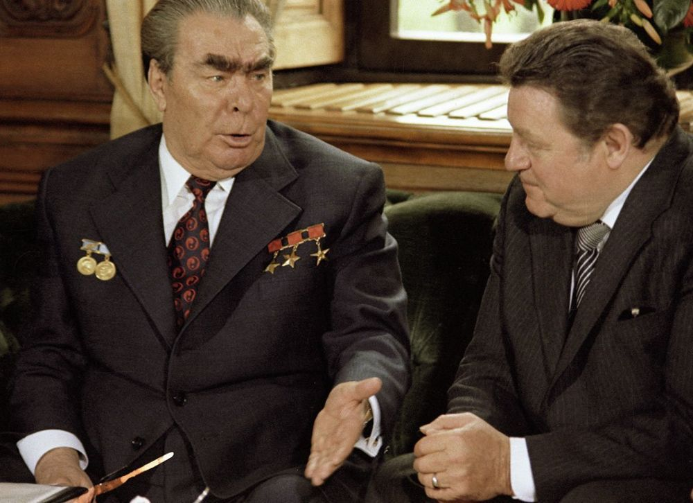 1978. Л.И. Брежнев беседует с председателем Христианско-социального союза Францем Йозефом Штраусом (1915—1988) во время визита в ФРГ
