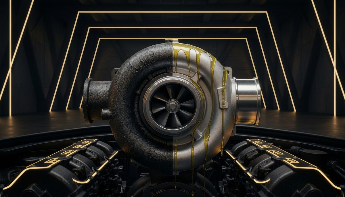 Турбокомпрессор получает масло из общей системы смазки двигателя, но условия его работы куда жёстче. В зоне подшипников турбины температура легко поднимается выше 250–300 °C, а частота вращения достигает сотен тысяч оборотов в минуту. Обычное масло в таких условиях коксуется и сгорает, превращаясь в твёрдый нагар.