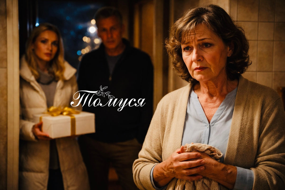 Валентина Сергеевна стояла в дверях, вытирая руки о кухонное полотенце — вышитое, ещё от свекрови. На пороге — молодая женщина лет тридцати двух, в белом пуховике, с аккуратной укладкой. В руках — коробка, перевязанная золотой лентой. Голос бодрый, улыбка открытая, глаза светятся ожиданием праздника.