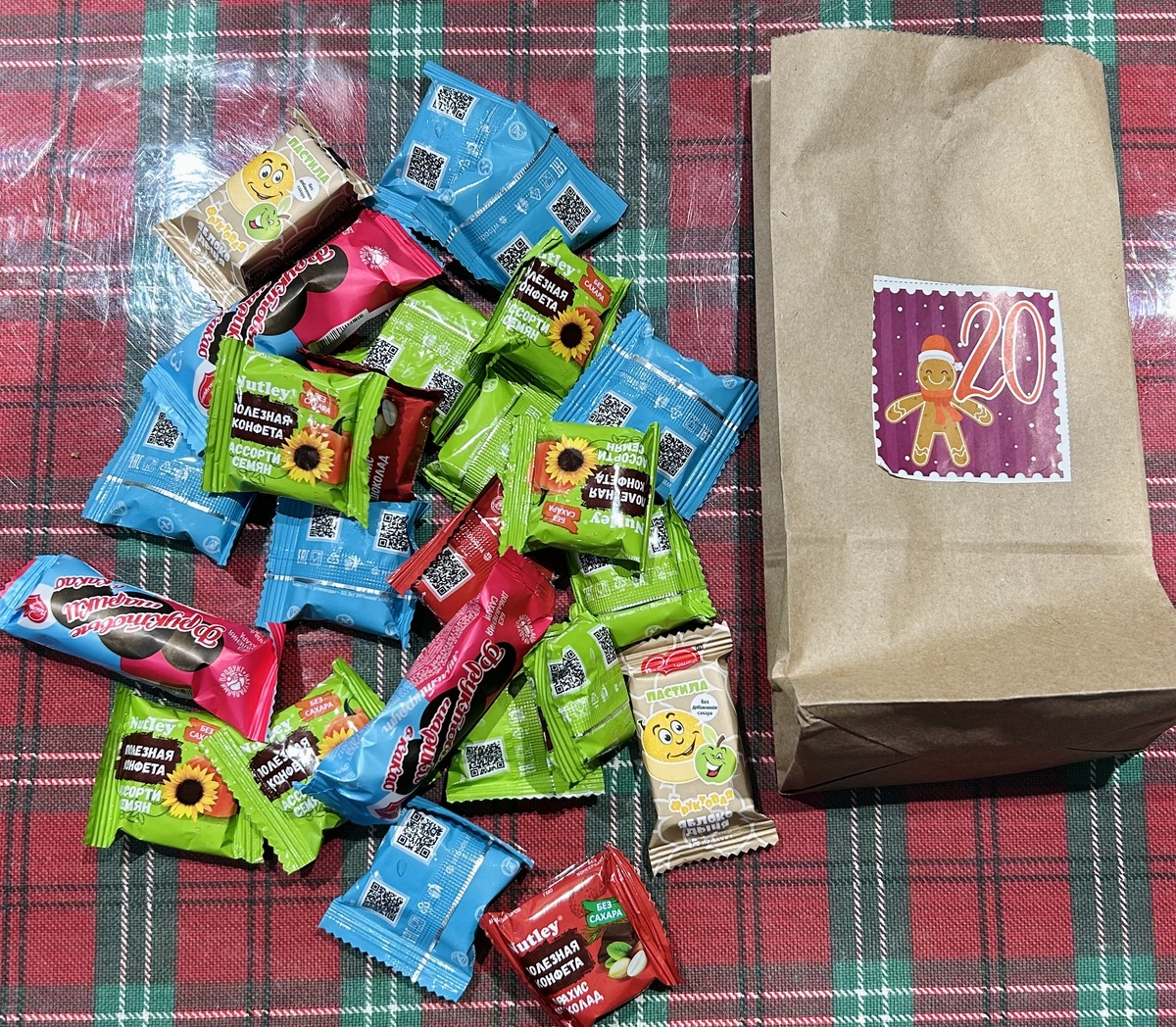 Стала я конфеты раскладывать и поняла, что их мало! Вот как так? Придётся завтра ещё докупать. Думаю, мармелад можно взять. Хорошо, что на последний день не отложила это дело. Завтра докомплектую, и в понедельник отнесём подарок в школу.