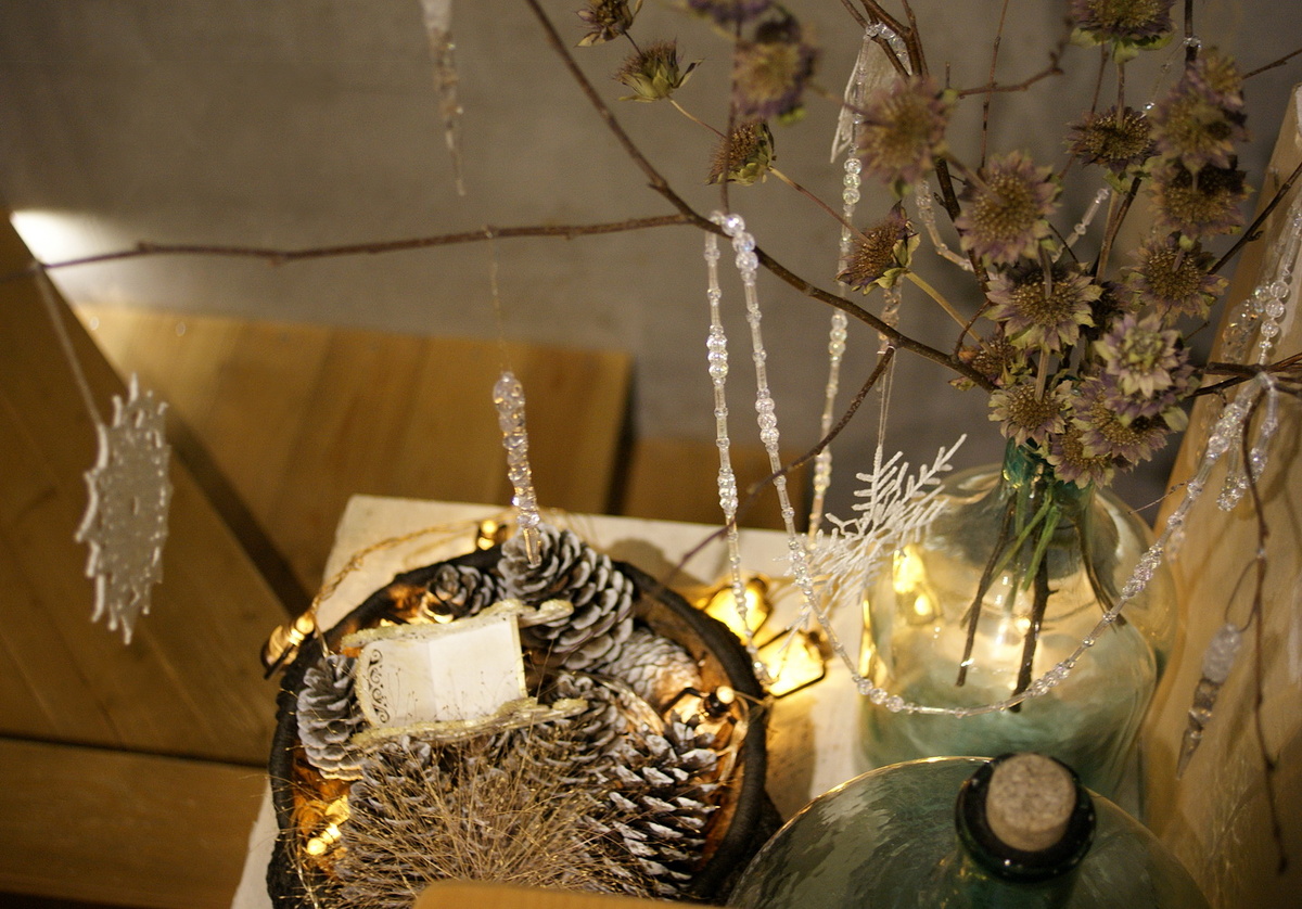 Композиция должна быть интересна с любой точки – что снизу, что сверху, что на уровне глаз, поэтому мне нравится ставить туда ветки берёзы и развешивать на них вязаные снежинки и акриловые украшения, они не заставляют тонкие веточки сильно изгибаться под весом, но слегка покачиваются и поблёскивают от движения воздуха.