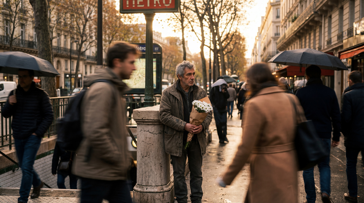 Седой мужчина стоял у третьего столба от выхода из метро. Он смотрел на часы. Потом на поток людей. Потом снова на часы.