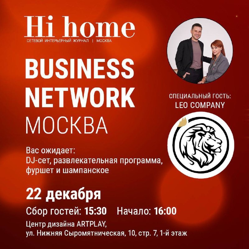 Hi home приглашает Вас на праздничный Business Network 22 декабря! 🎄 Это мероприятие быстрых бизнес-знакомств всего 5 минут, за которые компании рассказывают о своем продукте и услугах, а дизайнеры о своих потребностях и актуальных проектах и это великолепная возможность всего за 1,5 часа для дизайнеров найти новых проверенных поставщиков в разных направлениях, а для компаний познакомиться с новыми дизайнерами и потенциальными клиентами. 🎉 так же вас ждут: • Фуршет и праздничные напитки • DJ-сет и музыка • Розыгрыш призов от наших партнеров 📅 22 декабря 🕞 Сбор гостей — 15:30, начало — 16:00 📍 ARTPLAY, Нижняя Сыромятническая 10с7 Количество мест ограничено, для регистрации написать в вотсап +7 (915) 128-55-04 Анастасия