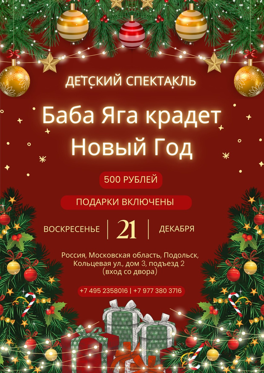 ✨ Баба-Яга крадет Новый год Завистливая Баба-Яга обманом затаскивает детей в лес, а злой Кащей переодетый в Дед Мороза крадет детей. Лишь Снегурочка может спасти своих любимых деток от коварства Баба-Яги. И спасти Новый год. 🚫 Возраст: 3+ 📆 21.12.2025 🕒 17:00 🏢 Досуговый детский центр "Умный досуг" 📍 г. Подольск, ул. Кольцевая, 3, под. 2 💰 Цена: 500 ₽ #Баба-Яга#Новый год#Детский спектакль# #нгподольск #спектакльПодольск #детямПодольск ⭐Поддержать канал голосом 🍰Где поесть в Подольске ✅ Мероприятия Подольск https://dzen.ru/id/66ed500f7b5671493eca3fd6 http://vk.com/podolsk_events http://dzen.ru/podolsk_events