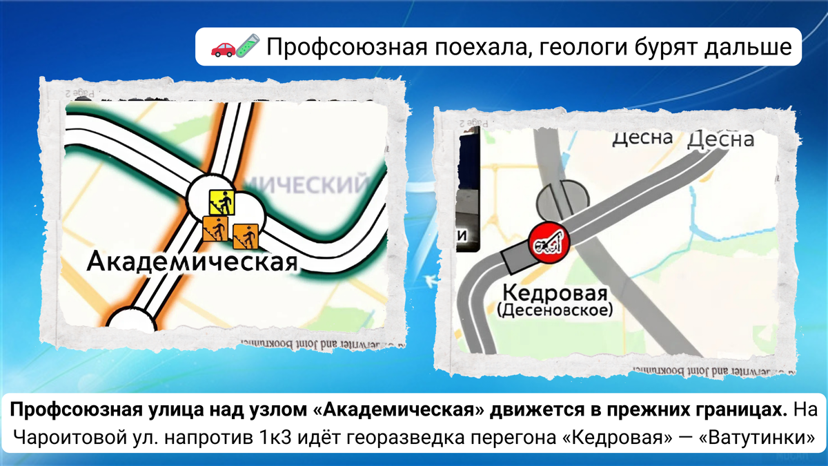 официальные отчеты. Давайте вместе разберемся, что же на самом деле происходит с нашей Москвой. Поехали? Восстановлено в прежних границах дорожное движение Профсоюзной улицы над площадкой строительства пересадки 🚇 «Академическая». Ведутся активные работы на строящемся выходе в город у д. 24 по ул. Дмитрия Ульянова. Облицовка камнем стен изнутри схода выполнена. Во второй части покажем геологоразведочные работы по трассе🚇 перегона «Кедровая» – «Ватутинки» 🏡 Троицкой линии напротив д. 1к3 по Чароитовой улице. ----------------------------------------------------------------------------------- Ну