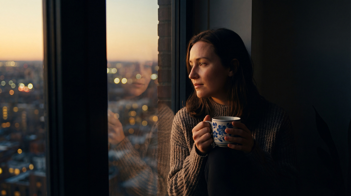 Вечер. Я стою у окна с чашкой в руках. Той самой, с синим узором. Свет не зажигаю.