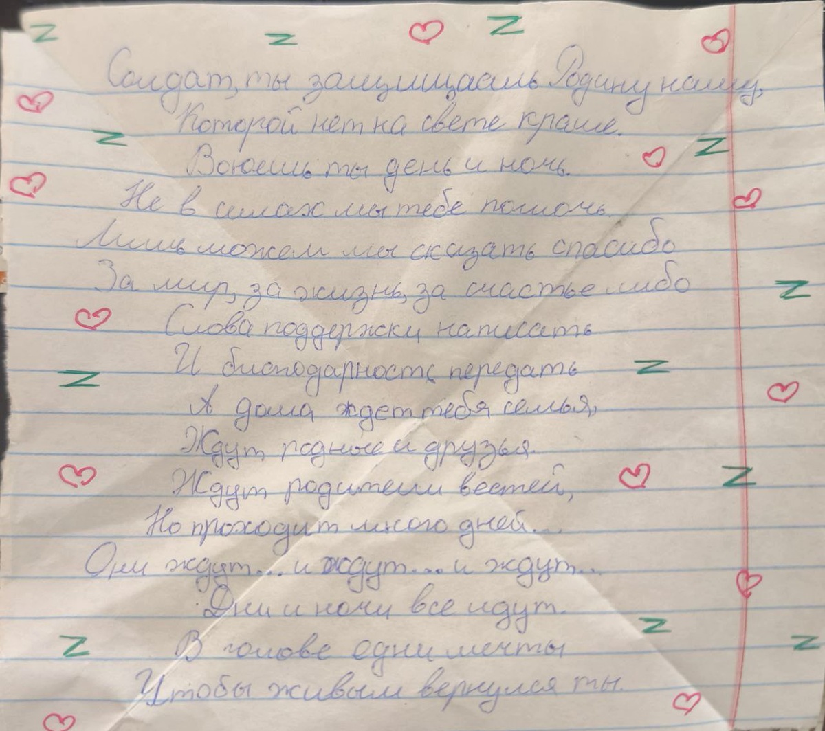 » Солдат, ты защищаешь Родину нашу, Которой нет на свете краше. Воюешь ты день и ночь. Не в силах мы тебе помочь. Лишь можем мы сказать спасибо За мир, за жизнь, за счастье либо, Слова поддержки написать, И благодарность передать. А дома ждет тебя семья, Ждут родные и друзья. Ждут родители вестей, Но проходит много дней... Они ждут... И ждут... И ждут... Дни и ночи всё идут. В голове одни мечты, Чтоб живым вернулся ты. 2025 год Поддымкина Анна, 6 «Е» класс школы 1528, корпус 844, г. Зеленоград Подписаться | Связаться с полком Служить в полку