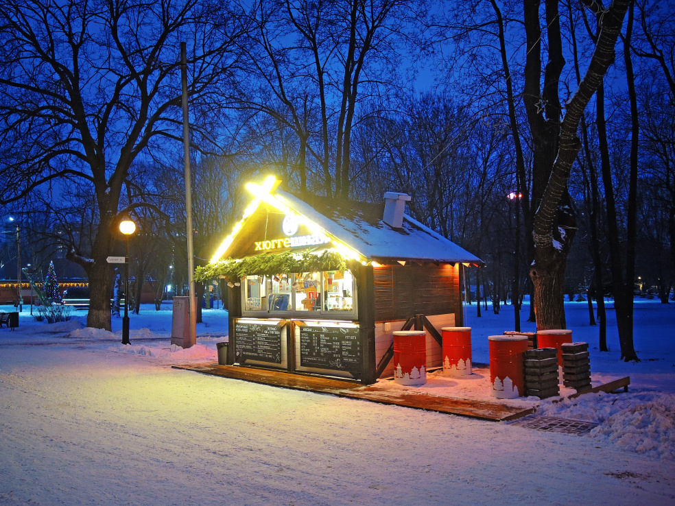 Предлагаю прогуляться по очередной точке на новогодней карте Самары сезона НГ2026. На этот раз мы посетим парк имени Юрия Гагарина. Сам парк к празднику украшен довольно скромно. Что, в принципе, в текущих условиях вполне уместно. Основная часть иллюминации и украшений приходится на многочисленные избушки-кормушки. Обходить их все не стал. Для примера в кадр взял пару штук. Муниципальная часть оформления сосредоточена около входа со стороны пересечения улиц Советской Армии и Стара-Загоры, рядом со стадионом. Здесь в зимнее время работает прокат коньков. Отсюда же начинается ледовая дорожка. Здание, где располагается прокат, последние несколько лет украшается одинаково. Но всё хотя бы находится в исправном состоянии, работает полностью, что по увиденному в городе в этом году является самым главным достижением. Традиционные гирлянды почти по периметру, надувные голова и руки Деда Мороза (единственный выживший объект из серии подобных) и световой олень. Почему олень, не понимаю по-прежнем